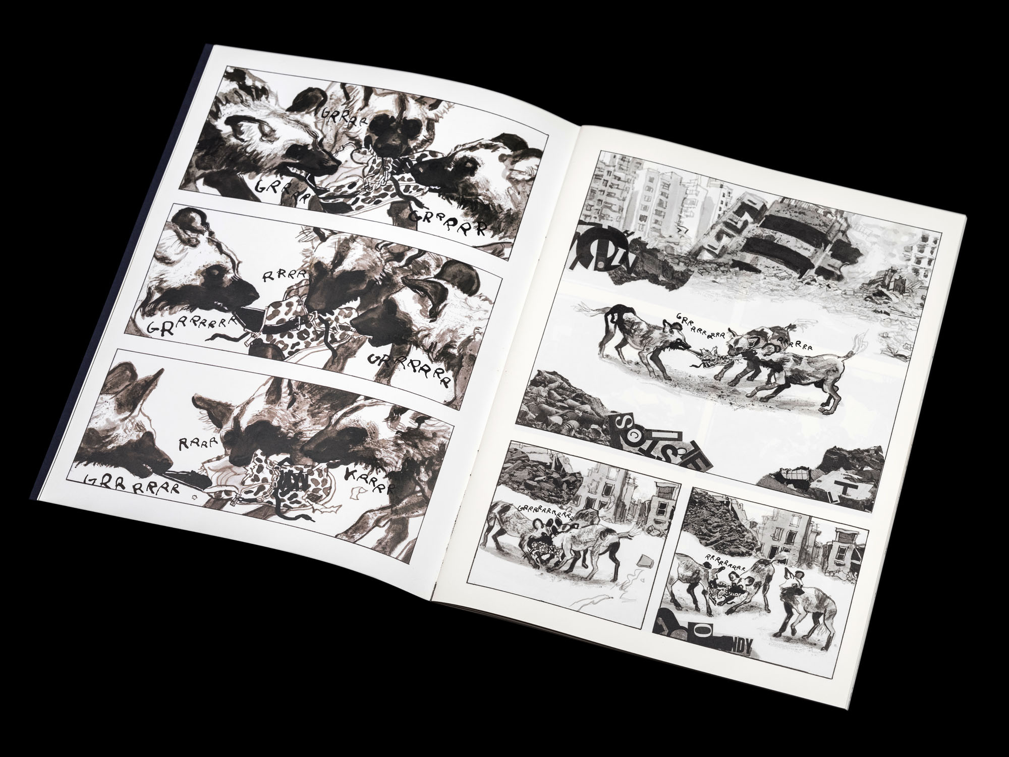Pourquoi atypique ? Parce que la course de cet homme quasi nu pour sa survie dans un environnement où ferraille et béton font office de végétation est simplement muette. Un défi que s’est lancé l’auteur, une rareté dans un registre réaliste. La dynamique des corps, la mise en scène, le cadrage… tout ce qui concourt au langage propre de ce média particulier qu’est la bande dessinée est mobilisé pour offrir au lecteur une expérience inédite.